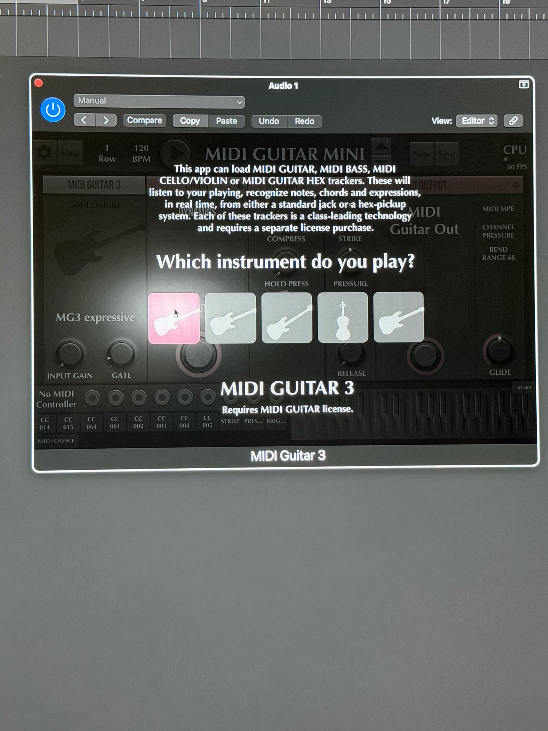 I instantiate Midi gtr 3 plugin on audio track. (audio fx), with input monitoring, and select MINI GTR MINI on plug-in - YES