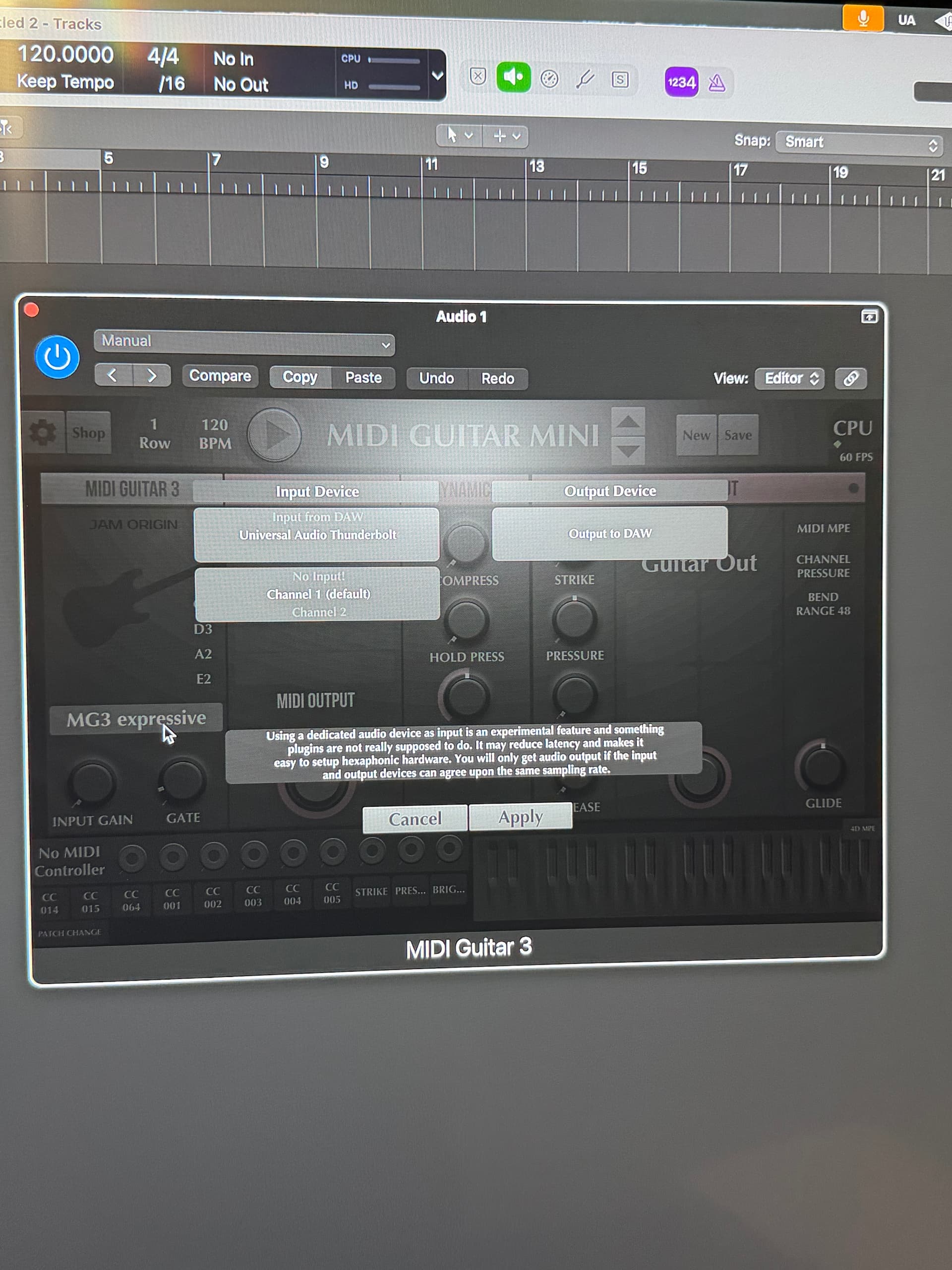Occasionally I get a message in the plug-in saying that my DAW is set at 1024 sample buffer — which it isn’t — but i go in anyway and switch and APPLY and message goes away …..I am not getting MIDI signal talk between the software instrument and audio track
