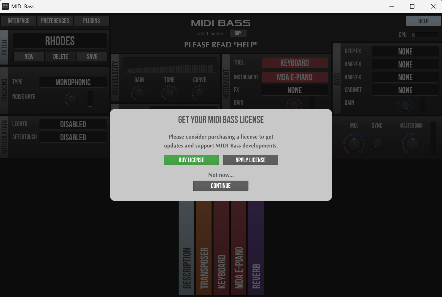 After some testing, today I decided to buy MIDI Bass 2. I clicked on the BUY button and the software sent me to the MIDI Bass 3 purchase page. Not being able to find any other page where to purchase version 2, I proceeded and bought version 3. The thing is that version 3 is – probably at the present state of things – way laggier and less accurate than version 2!