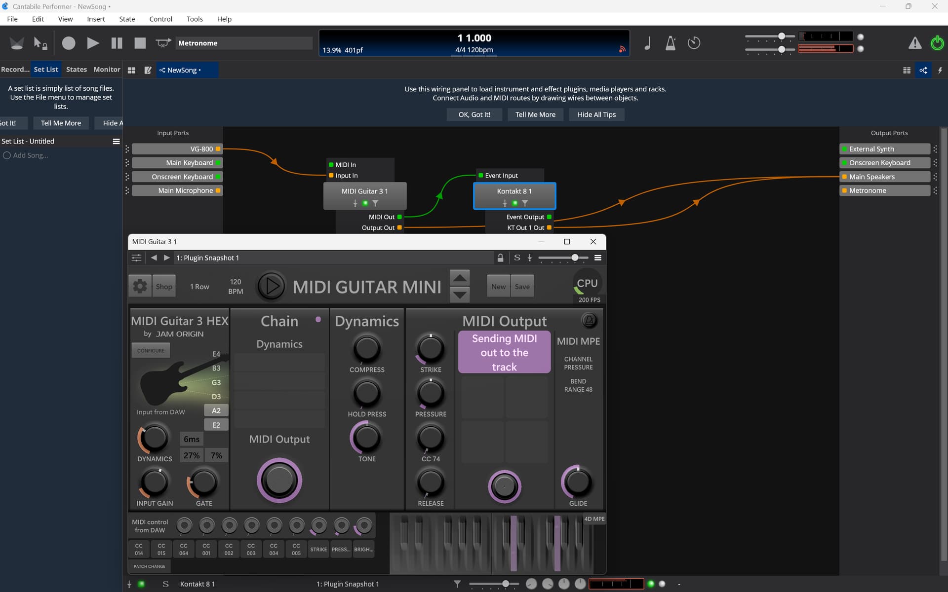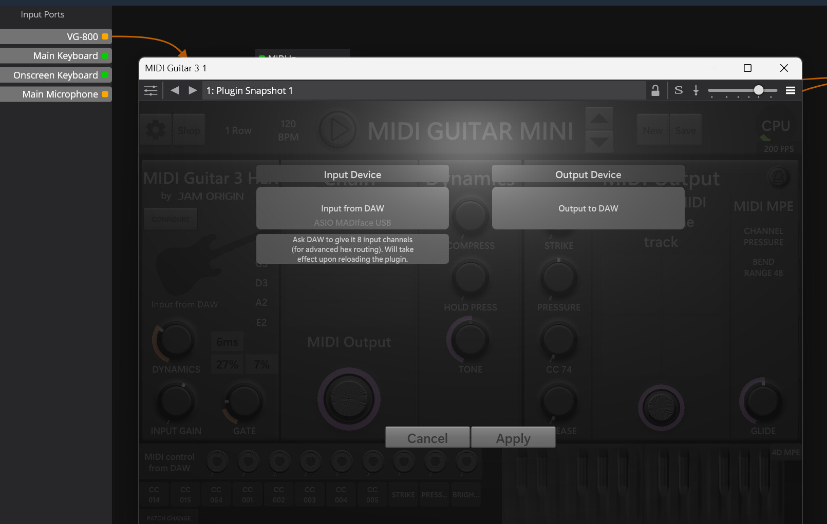In the videos I have watched standalone MG3 appears to automatically map the audio stream from the device. In my case I want to use my live DAW Cantabile, in which case you build audio line inputs/output with your own names. I have also seen MIDI Caster tool for getting around this, but I prefer to have my DAW in control.
