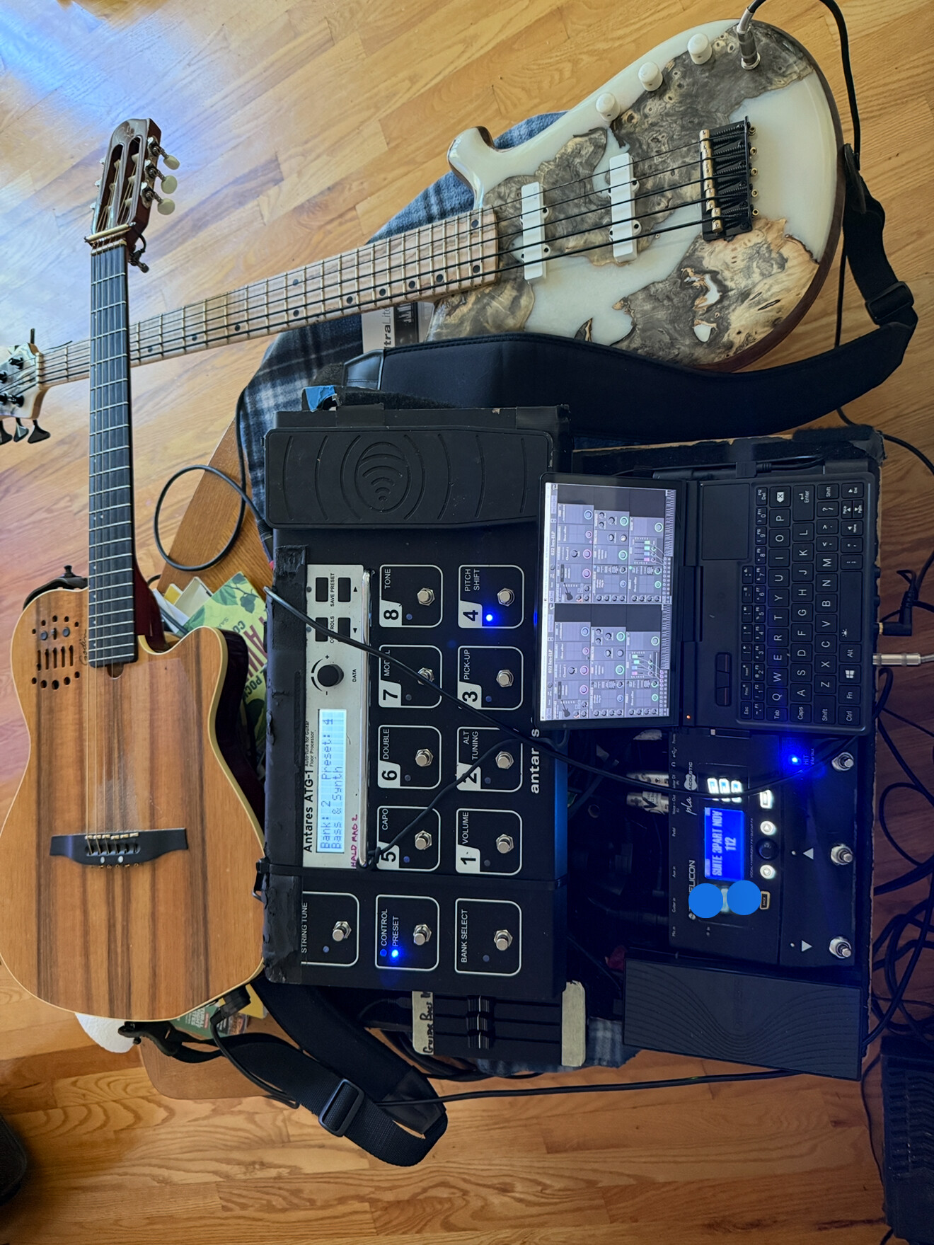 Gig Performer is very powerful and also very complex. I dove headlong into it the last time I tried to make a gigable mini computer rig. I needed it to solve midi issues with SampleTank. This time I have avoided SampleTank completely, and I’d like to avoid Gig Performer too. Stand alone mode with MG3hex is really excellent, and it’s proved stable. You open one program, it’s easy to set up, clean interface and it works! If I didn’t want to switch instruments and have synth access for both guitar and bass, the standalone program would be all I need! Right now running two standalones, patched together with loopmidi and midi Ox should work, but it’s less than optimal because the current the mini rig is on the floor, the screen is tiny and hard to read, and I have to open two MG3s and choose audio inputs on each (did I mention the screen is tiny…). If I’m only using one hex guitar, it’s easy, just open MG3 and go! Hopefully, saving audio inputs with patches will be a future update, then I won’t need to open two MG3 and use the work arounds.
