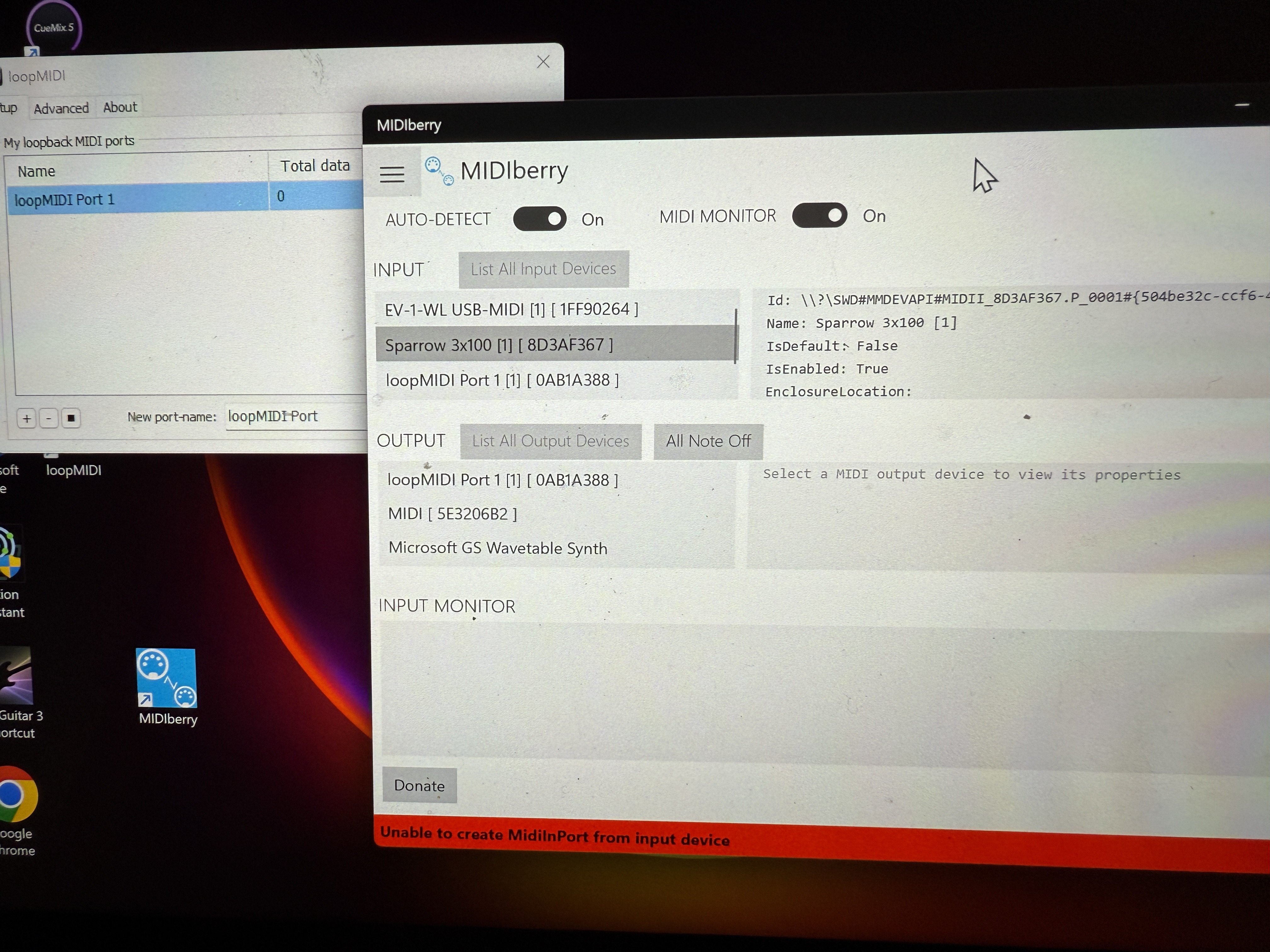 I’ve installed midi berry and loop midi. MG3 shows loop midi in its list. When I click on my devices in midi berry, I get the message in red at the bottom, which says “unable to create midi in port from input device.” I think that’s ok since these devices are only outputting midi CC. When I click the OUTPUT section it shows blue for every device. At first Midiberry showed no data in the monitor section when I activated any of my controllers, but after a restart it showed data for each device if (and only if) I highlighted that device in the list. MG3 now receives data from the Loopmidi port, but only receives from whatever device is highlighted in MidiBerry. So it’s sort of working, but I need it get data from all my midi controllers, (faders and exp pedal) not just the highlighted one.
