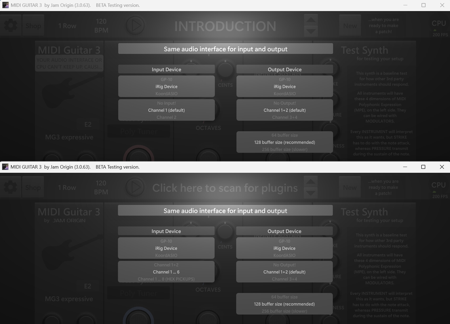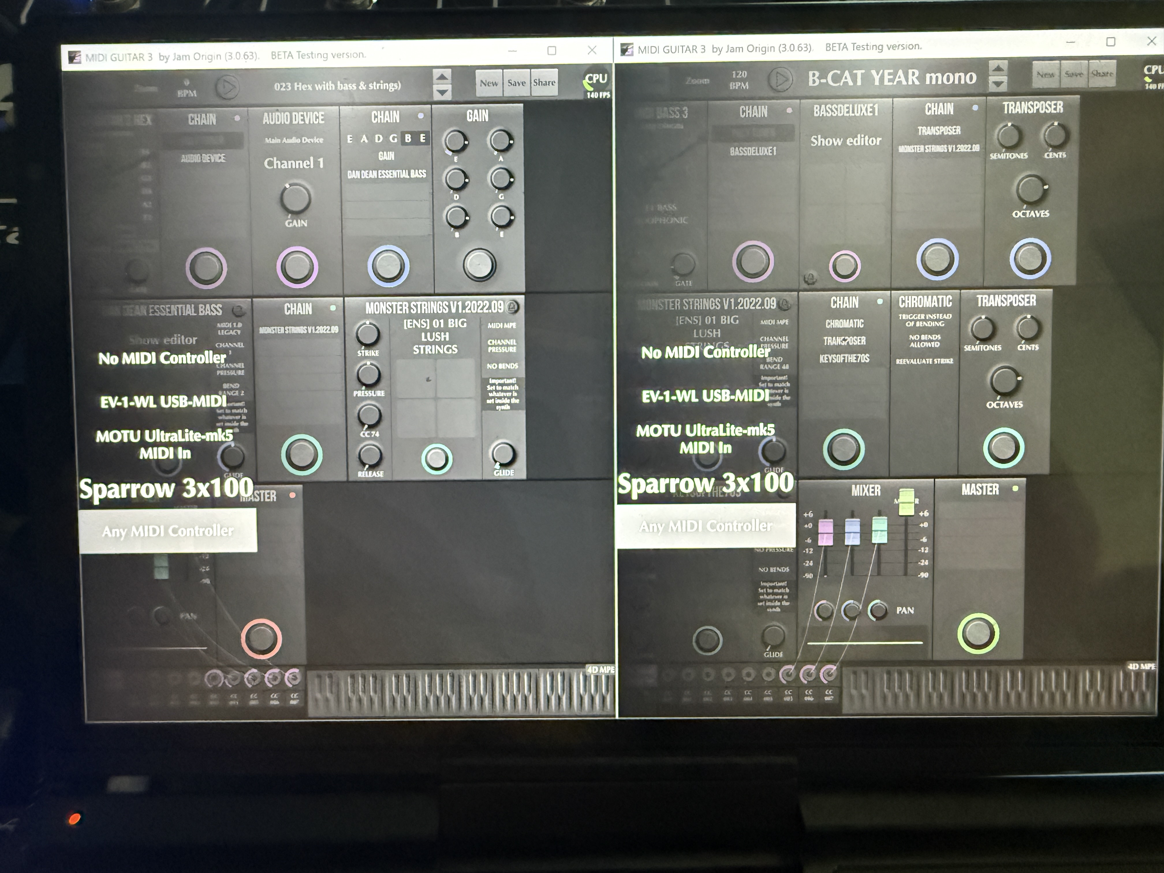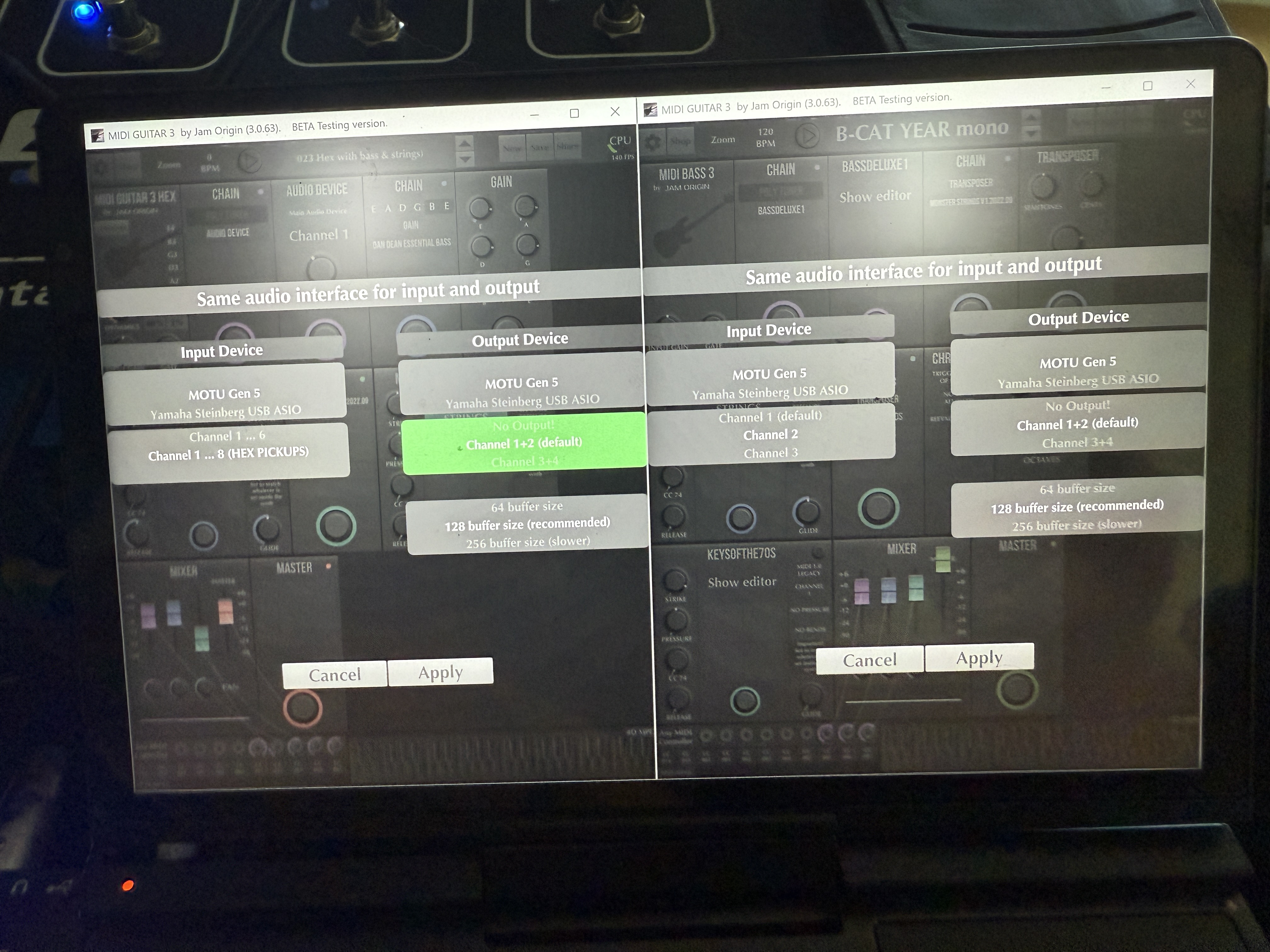 It did work!! Both instruments plugged in, one hex and one single channel bass, both working fine! Potentially I could just pick one up at the gig, and put it down and pick up the other one. But there is one problem preventing that. Midi control only works on one of the MG3s. Both instances show all the midi devices in their lists, but only the hex side is responding to CC messages . However, both instances respond to PC messages. If I can solve this midi cc issue, I can test it on a gig and see if running 2 standalone MG3 overheats my little computer. Here is a video of the behavior https://youtu.be/3u7lp8pN_N8?si=K9ebTSSgB6BGX894