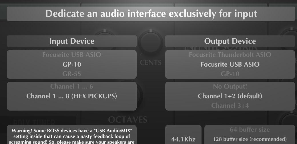 Whenever I change the ‘AUDIO DEVICES’ configuration in MIDI Guitar 3. GP-10 ‘No Input!’ is always set even though I’ve previously Applied Channel 1..8 (HEX PICKUPS). Very frustrating. It’s like it doesn’t actually get set because when I click apply I go back to the original screen with ‘No MIDI Input’