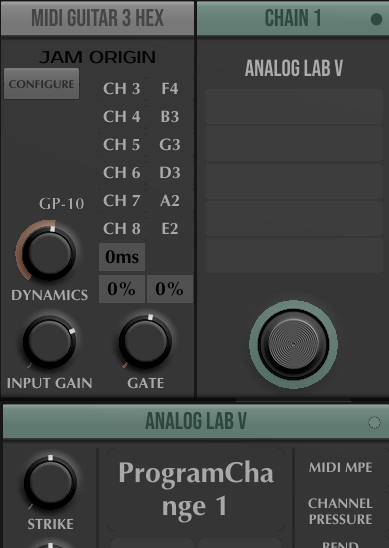 When I gently pluck an open low E string, multiple higher strings are displayed on the Seeboard keyboard display (and are sounding) even though I’m muting all but the low E string, so it’s not sympathetic vibration. II’ve tried both my ‘Made for Roland’ Strat and my Godin XTSA. I’m also wondering why when I turn up Chain 2 in the mixer I get a weird distorted sound even though I’ve removed all modules except Analog Lab V in Chain 1 (no modules in Chain 2 or 3). It’s almost as if there are native sounds from MIDI Guitar 3 playing along with the Analog Labs sounds unless I turn down all but chain1 in the mixer.