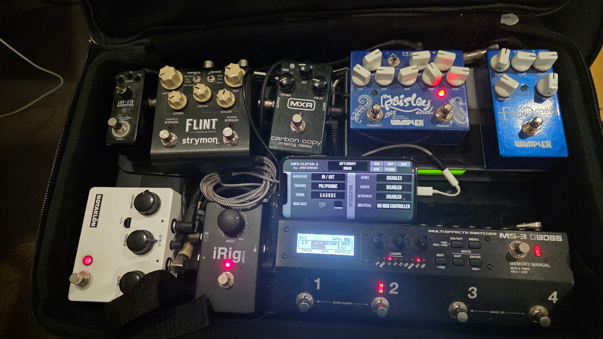 Hi there! I have been a MIDI guitar 2 customer of yours for five or six years. I’ve been using it on my old iPhone X on my pedal board and it has worked flawlessly, it’s awesome! I will post a picture. I have been eagerly awaiting your iOS release for MIDI guitar 3! I in live the San Francisco Bay area and I’ve played hundreds of festivals with this rig and have even taken it abroad playing in Western Europe multiple times.