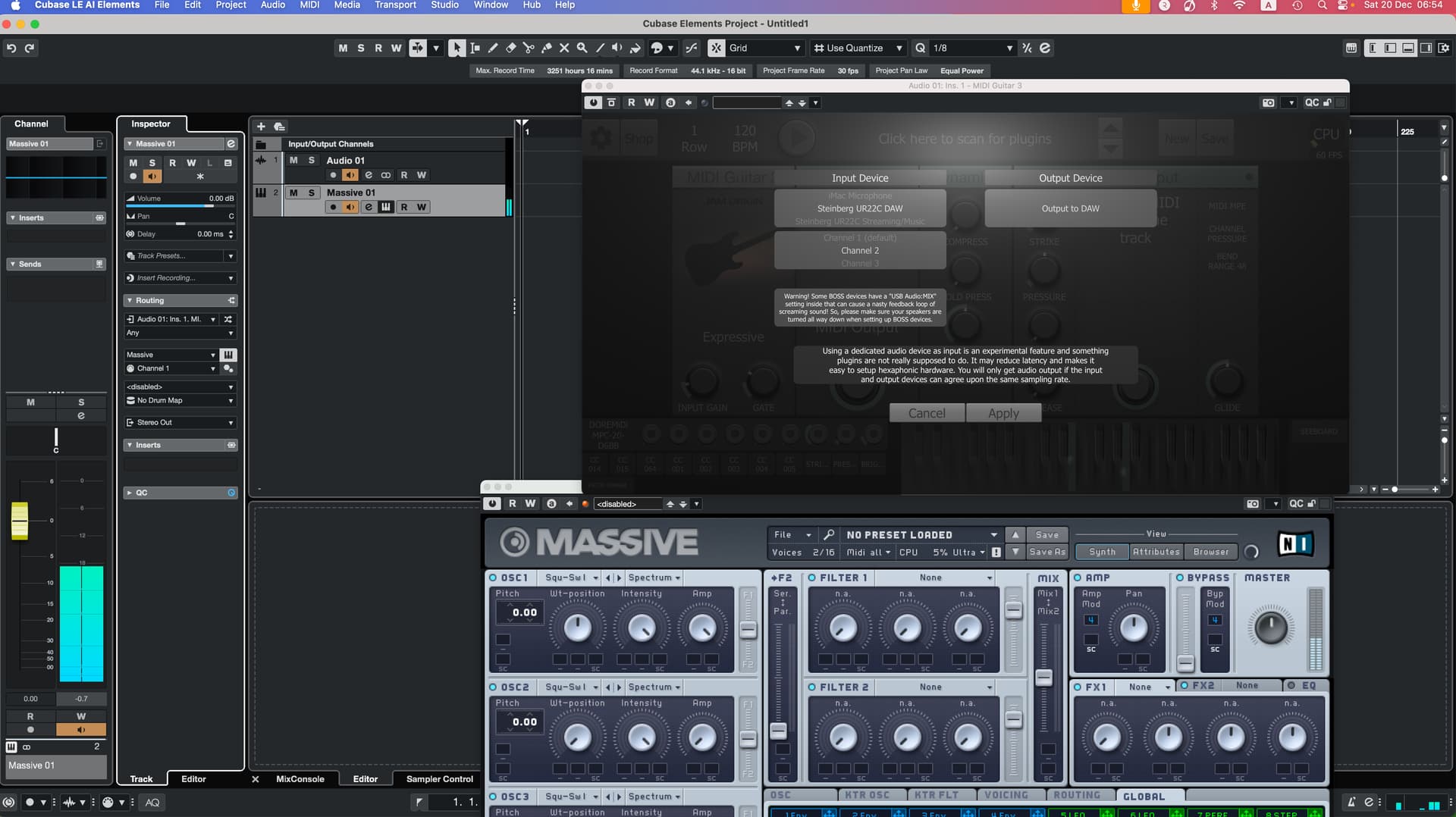 I am using cubase elements 14 on a Mac. i followed the cubase instruction video and nothing is happening. As the video shows, i first plugged my guitar into my ur12 interface (tried both inputs) and made sure I could hear my guitar. As well, i loaded an instrument into a track and was able to hear a synth i loaded while playing my keyboard. this tells me that my interface is working as it should.