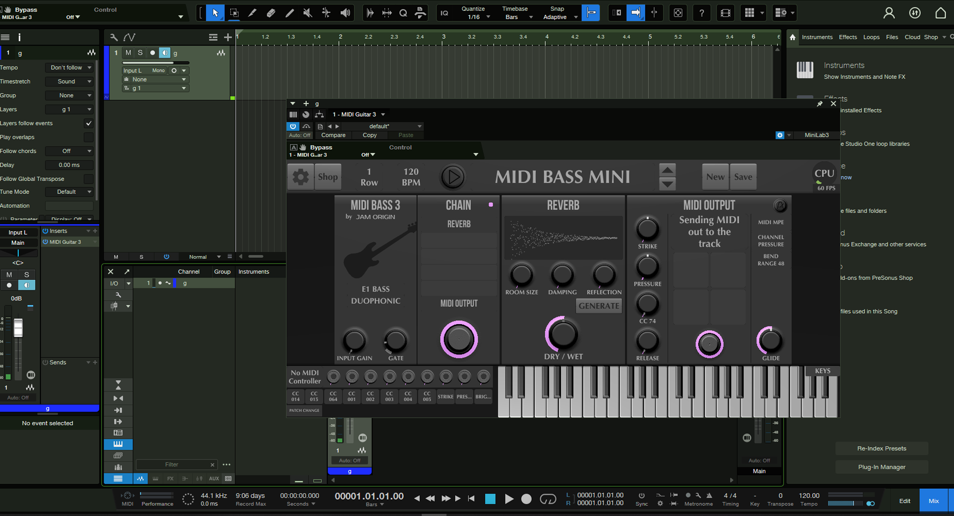 Create a new patch in MG3 and you will have 3 empty chains and the “Fader-Mix-Block”. One chain you use for your guitar input if you need that and in the second chain you insert the MIDI output module to make the MIDI output of MG3 available to your DAW (instrument tracks).